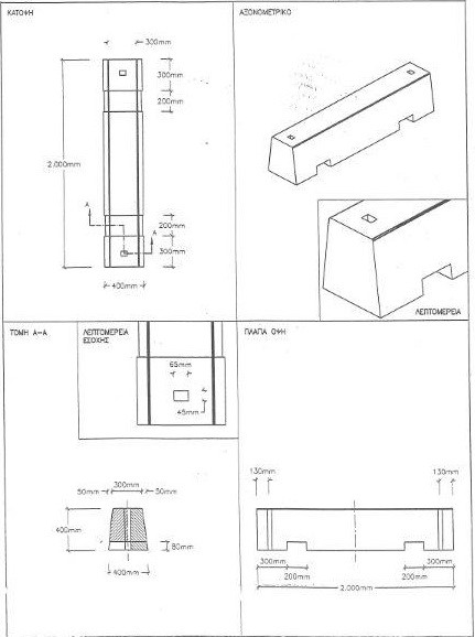 Τα κράσπεδα προσωρινής οριοθέτησης θα είναι από οπλισμένο σκυρόδεμα ποιότητας C20/25 και χάλυβα οπλισμού S500s θα έχουν κωνικό σχήμα, οι δε ακριβείς διαστάσεις τους εμφανίζονται στο πιο κάτω ενδεικτικό σχέδιο.